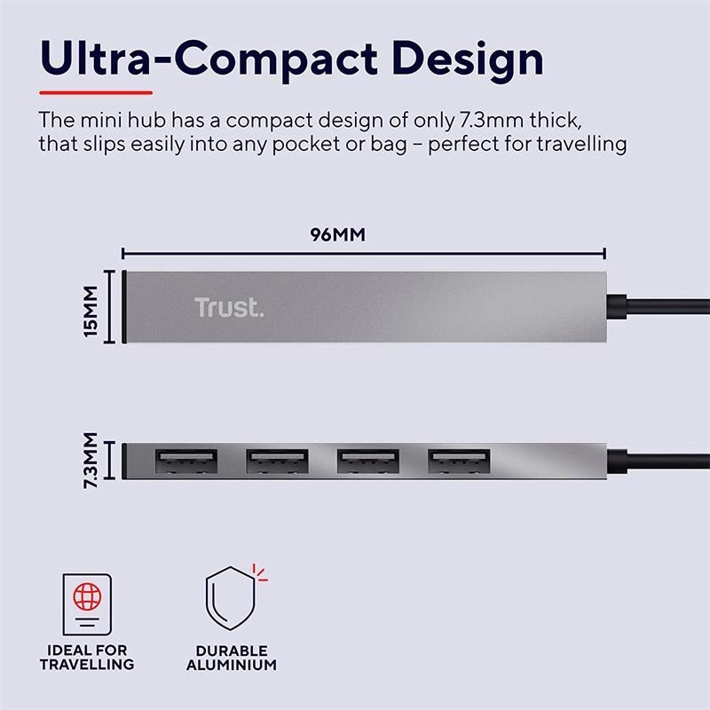 El diseño ultracompacto de 7,3 cm de grosor permite almacenar o transportar fácilmente el hub USB en desplazamientos diarios o viajes de trabajo.