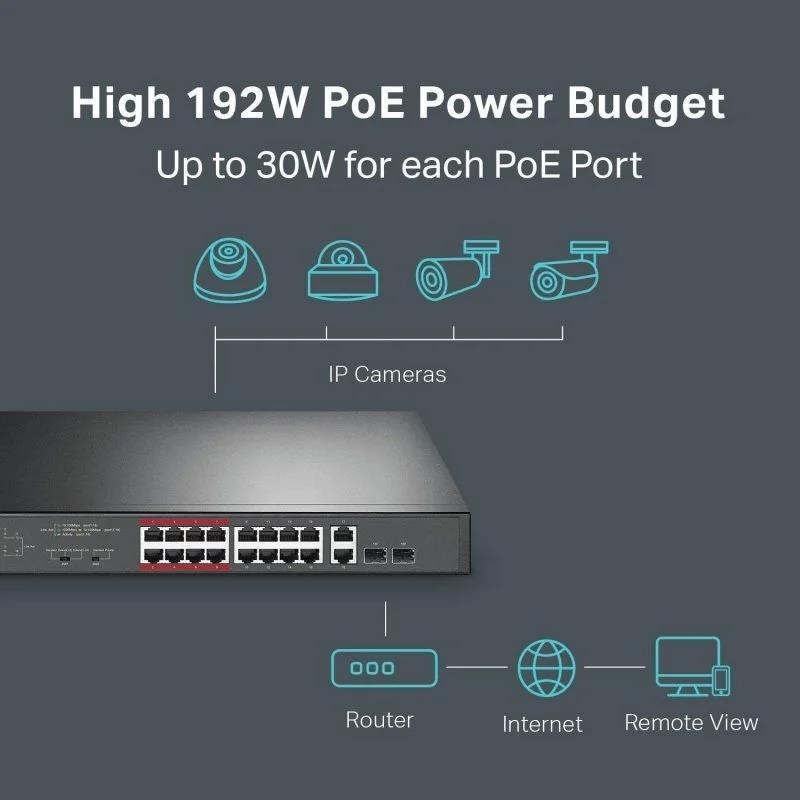 Switch PoE + de 16 puertos dedicado (presupuesto de 250 W) para numerosas aplicaciones: El cumplimiento del estándar 802.3af / at PoE + admite hasta 30 W en cada puerto PoE. El presupuesto total de energía PoE de 250 W * para los 16 puertos PoE + hace que tenga una amplia gama de aplicaciones, como vigilancia, oficinas, dormitorios y pequeñas empresas. Es totalmente compatible con cámaras IP, puntos de acceso, teléfonos IP, computadoras, impresoras, etc.