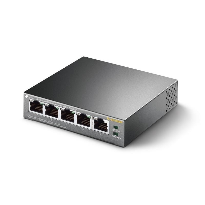 TL-SG1005P se trata de un switch de 5 puertos 10/100/1000Mbps no gestionable, que no necesita ninguna configuración y proporciona 4 puertos PoE (Energía sobre Ethernet).