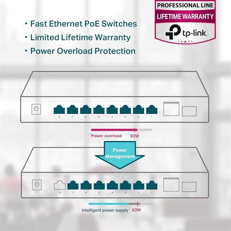 Con 8 puertos PoE+, transfiere datos y energía en un solo cable