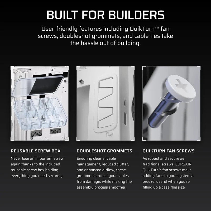Características amigables para el ensamblador - Una gama de innovaciones de CORSAIR mejora la experiencia de construcción, incluyendo soporte para montaje vertical sin brackets adicionales, tornillos Quikturn de un giro, pasacables flexibles de doble inyección y cortes externos para la gestión de cables.