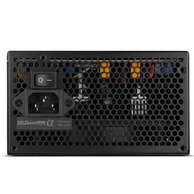 La Hummer Alpha 600 W de Nox es una eficiente fuente de alimentación para ordenador que asegura un rendimiento del 85 %. Con Certificado 80 Plus Bronze, incorpora un ventilador de 120 mm muy silencioso que favorece la temperatura estable del chasis, asegurando una adecuada refrigeración.