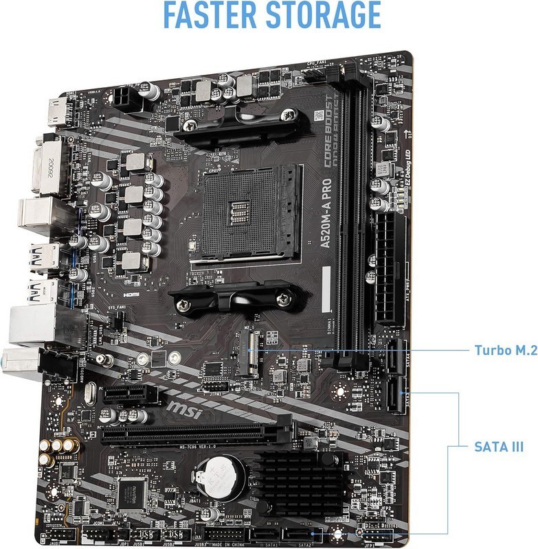 Placa base MSI A520M-A PRO (socket AM4, formato Micro-ATX) con chipset AMD A520, soporte para procesadores Ryzen de 3.ª y 5.ª generación, HDMI/DVI y soporte para memoria DDR4.