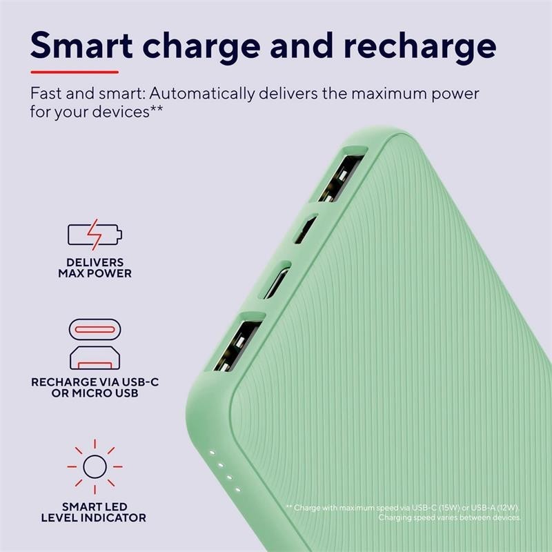 La batería externa Trust Primo de 10 000 mAh es rápida e inteligente: ofrece automáticamente la potencia máxima para los dispositivos**. Además, la batería externa se puede recargar rápidamente con el cable micro-USB incluido o a través del puerto USB-C. El indicador de nivel LED inteligente de la batería externa permite saber cuándo es el momento de recargar.
