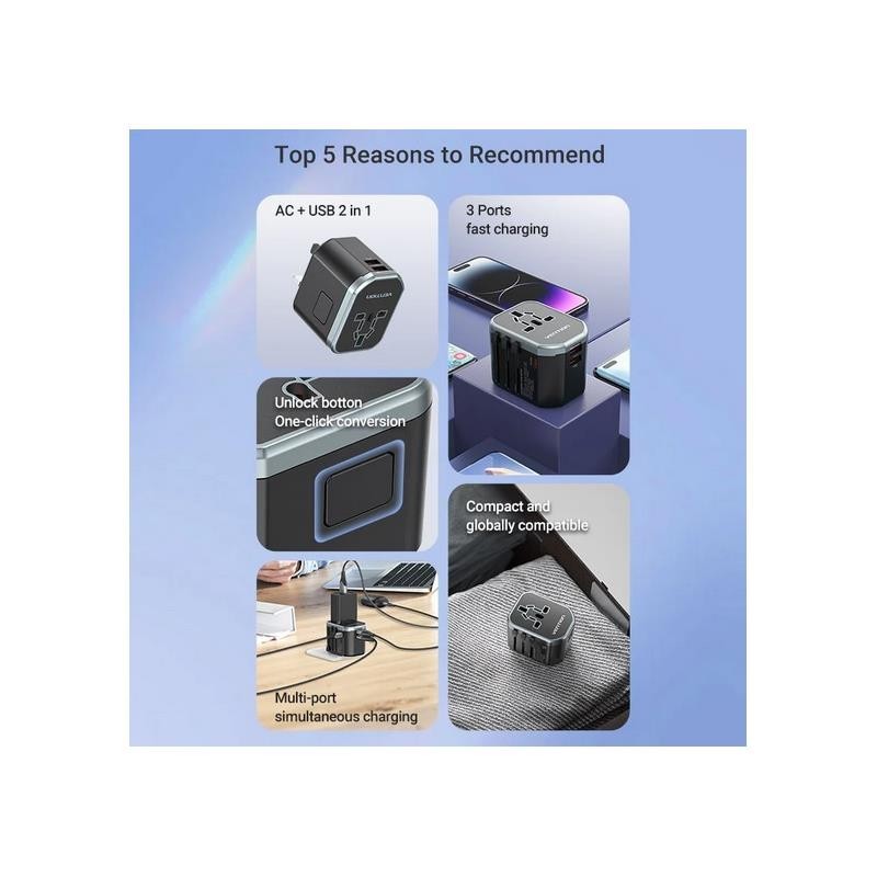 Enchufe múltiple compatible a nivel mundial: Ideal para usar en distintos países sin necesidad de adaptadores adicionales.