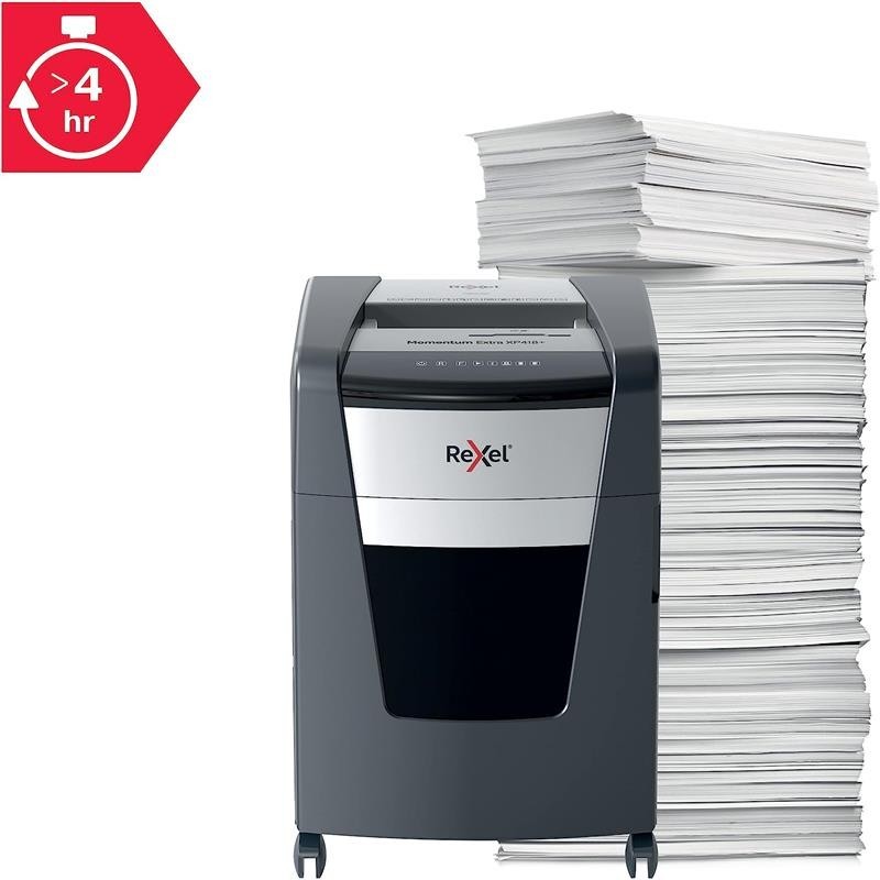 Las destructoras de papel sin atascos Rexel Momentum Extra son ideales para destruir documentos confidenciales en la oficina. La destructora XP418+ destruye hasta 18 hojas de papel A4 (80 grs) de una sola vez a través de la ranura de alimentación manual en partículas P-4 (4x35mm). La tecnología de detección activa mide el número de hojas que se alimentan en tiempo real para detener los atascos y los errores de alimentación del papel; se indica mediante un LED rojo en el panel de control.