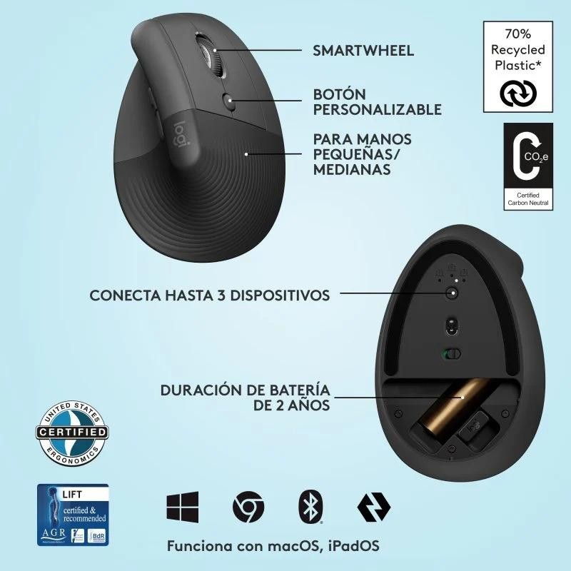 Vente arriba con Lift: Anima tu escritorio con el Ratón Ergonómico Vertical Lift de Logitech. Adecuado para manos pequeñas y medianas.