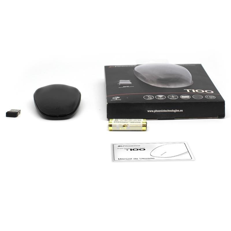 Características principales: Navega con comodidad y controla el ratón con la punta de los dedos Tecnología inalámbrica Plug&Play para una conectividad de largo alcance sin apenas interferencias Nano receptor que puede guardarse en la parte posterior del ratón Funciona con (2x) baterías AA Compatible con Windows 8, 7, Vista y XP Diseño ergonómico y acabado en negro Especificaciones técnicas: Ratón óptico inalámbrico Frecuencia: 2,4GHz Interfaz USB 2.0. Rango efectivo de uso: 15 metros Sensibilidad: 1.200 DPI Rueda scroll táctil Tecnología Plug&Play 4 botones incluyendo scroll Batería: 2 x pilas AA Requisitos del sistema: Windows 8, 7, Vista, XP, 98. IOS Color: negro Contenido de la caja: Ratón óptico inalámbrico Phoenix con rueda táctil Serie T100 Manual de usuario con tarjeta de garantía Nano-receptor Peso: Ratón: 95.2 ± 10 g (batería incluida) Nano-receptor: 1,6 ± 0,5g.